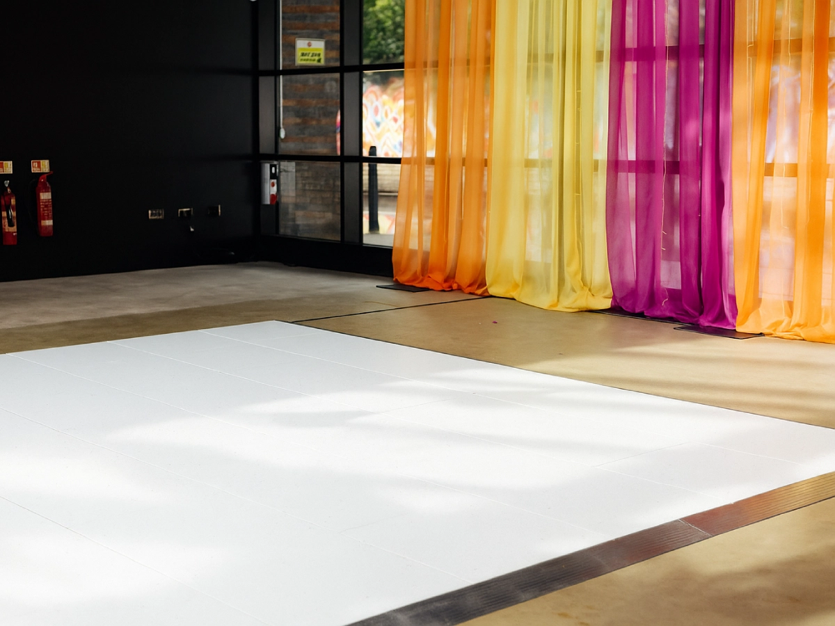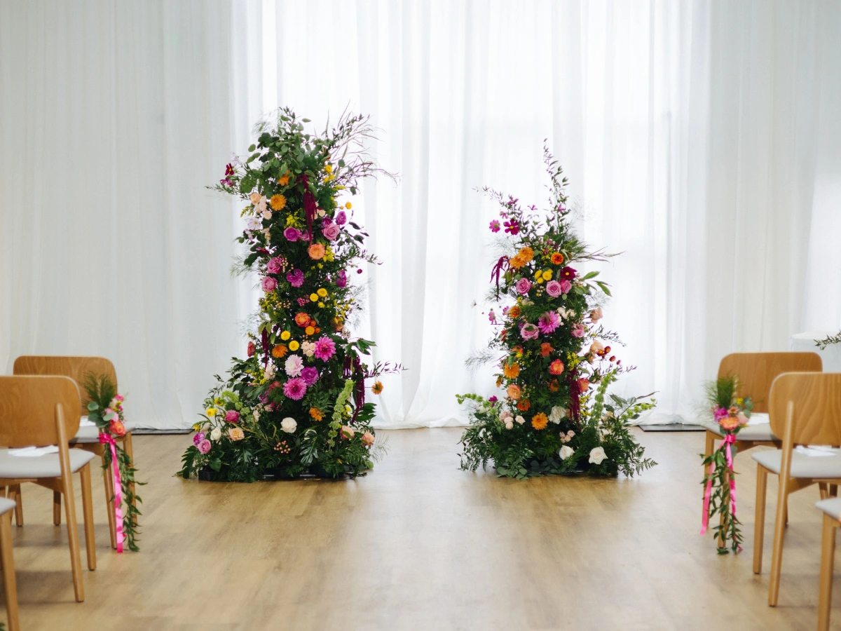 White wall draping created a clean, elegant backdrop that made the colourful floral arch at the end of the aisle truly pop, creating a striking and romantic focal point.