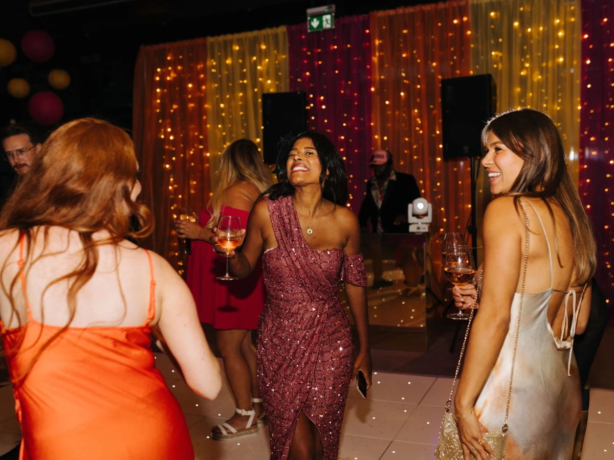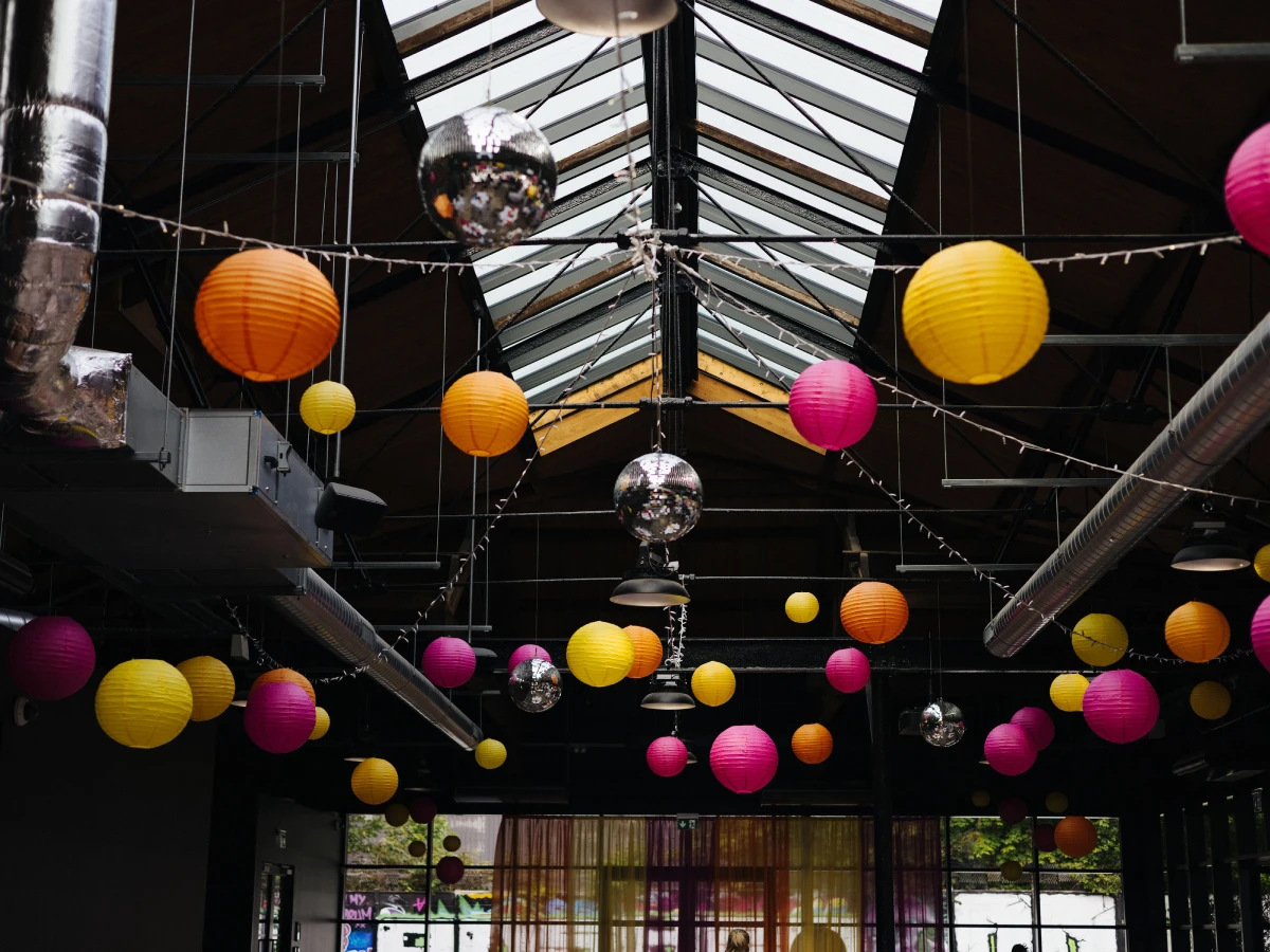 The DJ area featured a custom fairy light curtain in the wedding colours, set against a starlit dancefloor. Overhead, a fairy light canopy intertwined with disco balls and colourful paper lanterns created a fun, party atmosphere. 6ft lemon trees flanked the bar, adding a fresh, Mediterranean touch.